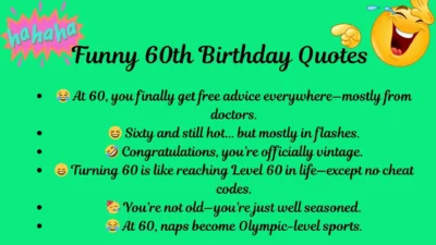 Celebration Jokes and Puns5 Min Read Margaret AtwoodonSeptember 25, 2025 84+ Best Jokes & Funny 60th Birthday Quotes to Celebrate Big Reaching 60 is a milestone worth celebrating with lots of laughter! If you’re looking for jokes funny 60th birthday quotes, you’re in the…