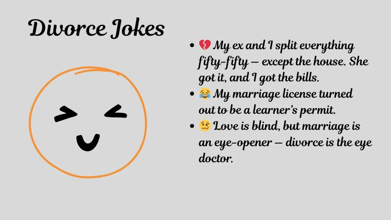 When life gives you lemons… sometimes you just sign the papers and start over! Welcome to the ultimate collection of divorce jokes — where laughter heals heartbreak and humor turns alimony into amusement.