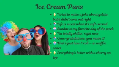 Food Puns4 Min Read Nora EphrononOctober 3, 2025 Chill & Sweet 222+ Ice Cream Puns 2025 Everyone loves a good scoop of laughter, and nothing melts stress like a clever ice cream pun! Whether you’re sharing a joke with a…