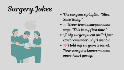 Body jokes and Puns7 Min Read Haruki MurakamionOctober 28, 2025 Hilarious Surgery Jokes and Doctor One Liners If you’re hunting for the funniest surgery jokes that can make even a surgeon drop their scalpel from laughter, you’ve landed in the right… Discover More